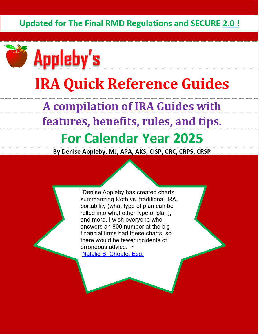 "Denise Appleby has created charts summarizing Roth vs. traditional IRA, portability (what type of plan can be rolled into what other type of plan), and more. I wish everyone who answers an 800 number at the big financial firms had these charts, so there would be fewer incidents of erroneous advice." ~ Natalie B. Choate, Esq.